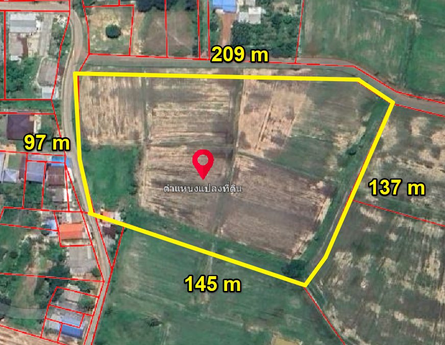 หน้ากว้างติดถนนคอนกรีต 97 เมตร X ยาวติดถนนสาธารณะ 209 เมตร