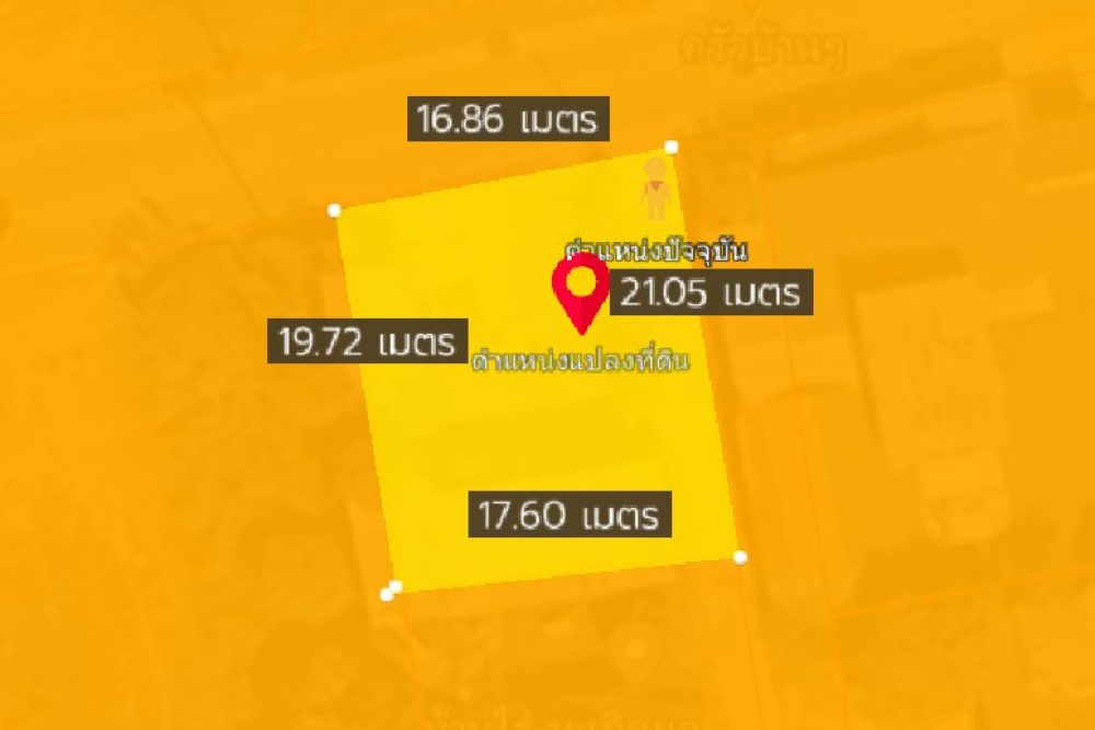 หน้ากว้างติดถนนคอนกรีต 16 เมตร X ยาวติดถนนคอนกรีต 21 เมตร