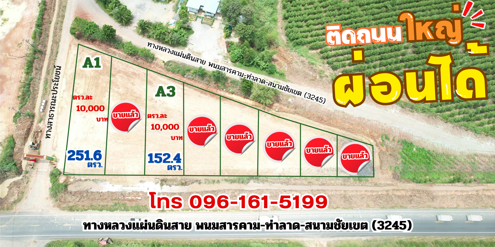CHON-589 ที่ดินแบ่งขายหัวถนน เริ่มต้น 63 ตรว. เหมาะปลูกบ้านทำสวน ถมแล้ว ติดถ.3025 อ.พนัสนิคม จ.ชลบุรี